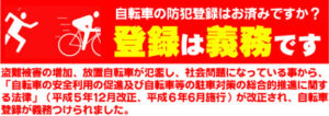 自転車の盗難予防防止及び放置予防と被害の早期回復(盗難自転車の返還)を目的として実施しています。登録事項は、防犯登録番号、自転車の種類、メーカー名及び塗装色等です。 登録料/700円(有効期間:10年)